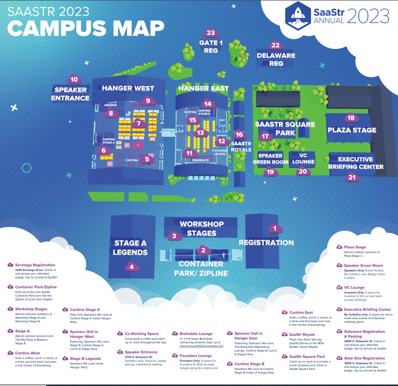 RIDE-SHARE / DROP-OFF: If you are taking an Uber, Lyft, or other forms of ride-share, the West Registration Lot located at 2650 S. Delaware Street is closest to the Main Event Hangers while the East 1346 Saratoga Drive is closer to the outdoor area of SaaStr.